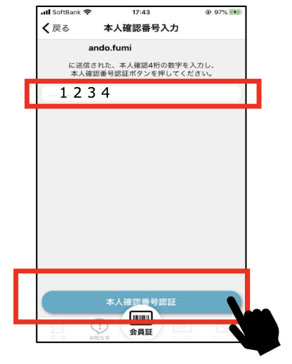 7.アプリに戻り、メールに通知された「本人確認番号4ケタ」を入力し、