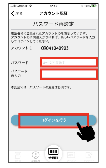 新しくご利用されるスマートフォンにて、ご登録頂いた電話番号とパスワードの入力が必要となります。